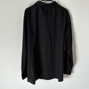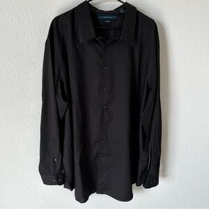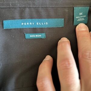 Sophisticated black dress shirt by Perry Ellis. Ideal for formal and casual settings. Classic design with button-up front and 100% cotton. No need to Iron!!