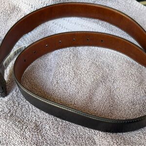 Elegant leather belt with a polished buckle. Black exterior with brown interior. Ideal for formal and casual wear.