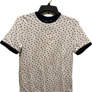 This Perry Ellis tee features a classic black ribbed crew neckline and trim on the short sleeves, set against a white backdrop with a delicate black floral pattern. Crafted from a comfortable knit material, it offers a fitted casual style that blends retro charm with contemporary flair.