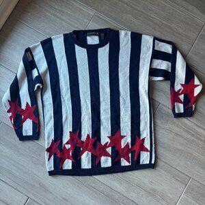 patriotic sweater, stars and stripes, Americana fashion, Perry Ellis top, cozy knit sweater, women’s large, casual chic