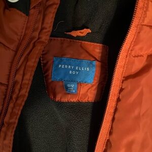 Vibrant orange jacket by Perry Ellis. Ideal for boys. Offers warmth and style.