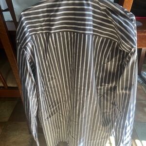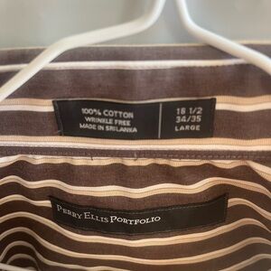 Stylish Perry Ellis dress shirt. Features brown and white stripes. Perfect for formal occasions.