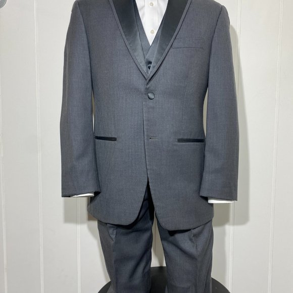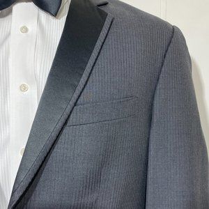 This is a Grey Tuxedo Jacket with a very light pinstripe and is considered a classic fit but has a slim feel to it. It has a double vent back and button closure on front.