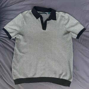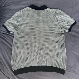 Stylish Perry Ellis men's knit polo shirt in a classic black and white pattern. Perfect for casual outings or a smart-casual look.