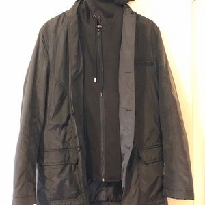 Lightweight utility jacket with hoodie attached. Option to remove hoodie by unzipping.
