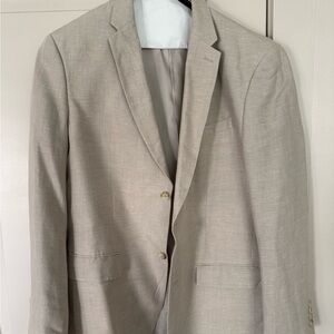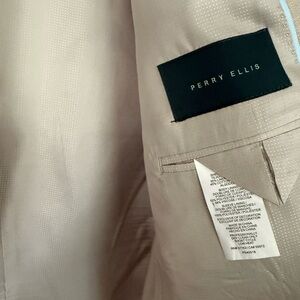 Stylish Perry Ellis blazer in light tan. Ideal for formal events. Features a sleek design.
