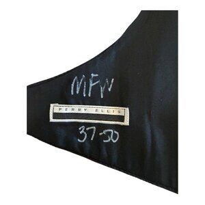 This listing is for one Perry Ellis Mens Formal Tuxedo Vest~Fit All 37-50~Maroon Black Geometric Print that is in good, pre-owned condition. White marker on inside of vest, but there are no rips, tears, holes or stains. 100% Polyester. Machine wash.