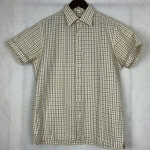 Perry Ellis Men’s Short Sleeve Button Down Shirt Beige Plaid Size Medium EUC