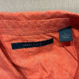 Perry Ellis Mens Button Front Shirt Sz Large Orange-Red w/White Dots Short Sleev