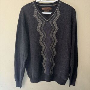 Perry Ellis MerinoSweater Large Mens GreyPrint Long Sleeve V-Neck Pullover L