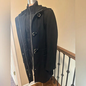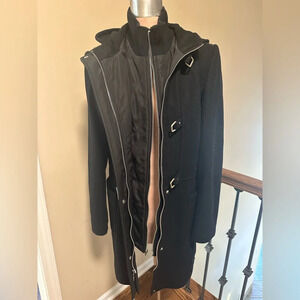 Perry Ellis Portfolio coat, black wool blend coat, women’s long winter coat, tailored zip coat, belted wool coat, buckle detail coat, quilted insert jacket, double layer coat, warm fall coat, elegant outerwear, business coat, city coat, classic black coat, Perry Ellis Portfolio women, size medium coat, dressy winter jacket