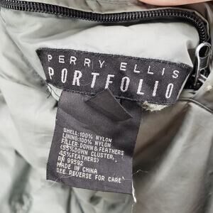 Perry Ellis Portfolio Men's Reversible Full Zip Down Feather Puffer Jacket Size Large. Shell and Lining 100%Nylon. Filler Down & Feather. Approx. measurements pit to pit 24.5 in. Sleeve length 24 in. Jacket length 30 in. Does have stains and discoloration on gray side of jacket. Missing one Zipper Teeth, But zipper does work. Pre-owned in good condition.