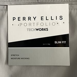 This listing is for new with tags Perry Ellis Portfolio Techworks Men's XL Pants. Slim Fit, Sits Below the Waist, Slim Leg, Slim Bottom Opening, Stretch Fabric, Elastic Drawstring Waist, Alloy (Silver). 96% Polyester, 4% Elastane, machine washable.