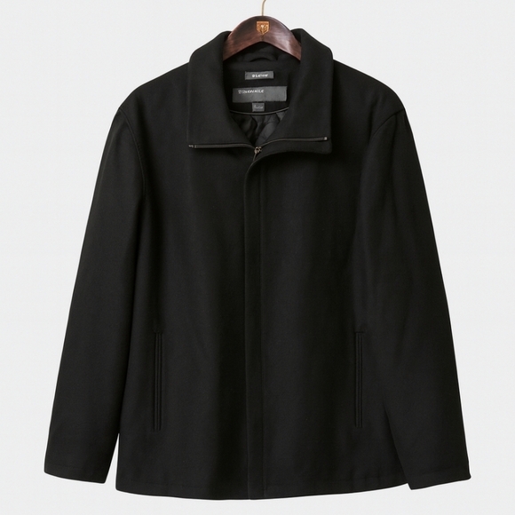 Classic and timeless black wool-blend jacket from Perry Ellis Portfolio, made in the Dominican Republic. Features a smooth quilted lining for warmth and comfort, a zip front with a hidden placket for a sleek look, and two side pockets. Perfect for dressy or casual wear during the cooler seasons.