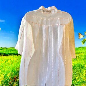 Perry Ellis SHEER SILK Blouse Pink Stripes Button Front Top Vtg 80's Womens 12