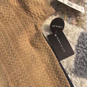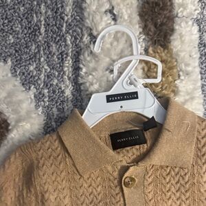 Charming tan cable knit shirt with button-down front. Perfect for stylish outings.