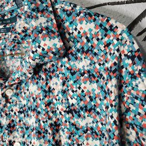 Printed with tiny multi-colored kaleidoscope of squares. This Perry Ellis men’s long sleeve shirt will help your style soar to new heights. The men’s pattern shirt is crafted from plain weave fabric for durability. Total Stretch lets you move freely throughout your day, while a sharp slim collar completes the sophisticated casual look.