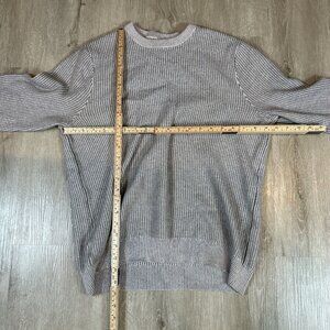 Perry Ellis presents a comfortable, casual, large, gray pullover sweater for men, perfect for business or cabin core style lovers. Made from a cozy mix of cotton and rayon, it features a mock neck and a striped pattern.