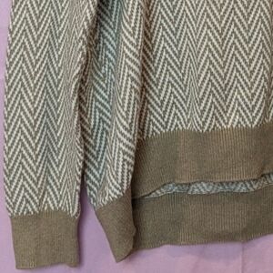 The classic chevron knit pattern in a neutral tan and white hue is timeless and can be easily accessorized in any season.