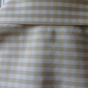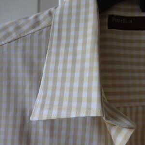 Perry Ellis men's button up short sleeve shirt, tan and cream gingham, size L, 100 % cotton, two pocket front,