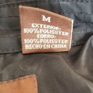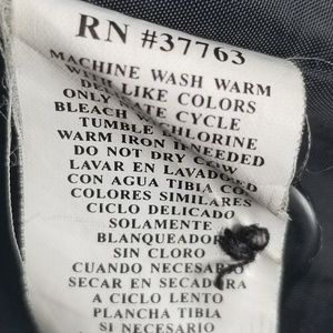a full zip black fitted jacket. two front pockets, one interior pocket on the left breast. slight discoloration on the exterior left breast (seen in photo, zoomed in)