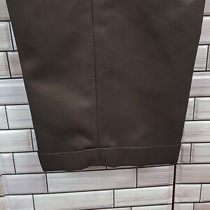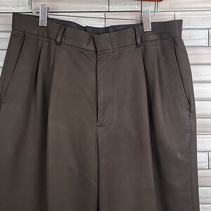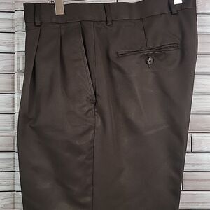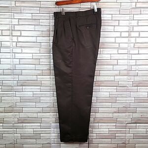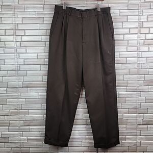 100% polyester dress pants in brown by Perry Ellis. A relaxed fit with a pleated front panel, slant pockets, two back welt pockets, and rolled cuffs. Good pre-owned condition. Normal signs of wash and wear, including ironing marks around pockets.