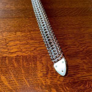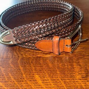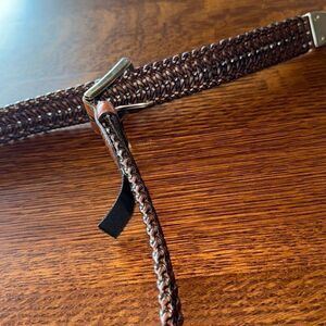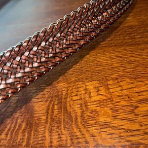 Dark brown leather woven/braided men’s belt. Adjustable length for placing buckle any length throughout belt. Excellent condition like new condition.