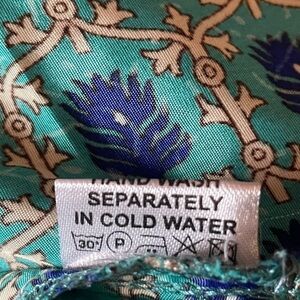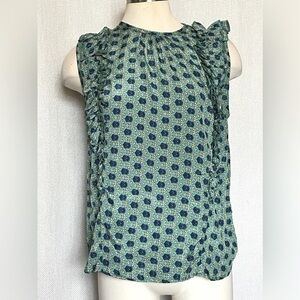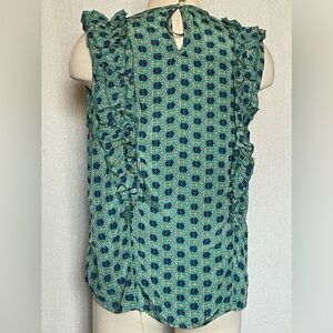 Silk blend. Teal background with Royal blue and tan decor. Ruffles from shoulder to waist in front and back. Great with slacks or skirt for work or dress up your jeans !
