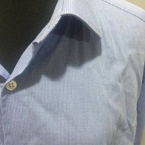 Great Perry Ellis Portfolio Mens Collared Shirt. It is blue with a slight checked pattern. I don't think this was ever worn. Size is 17 1/2, 34/35.