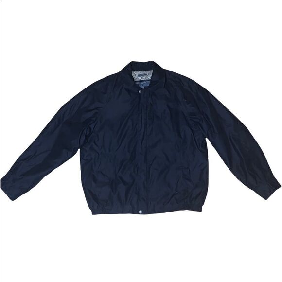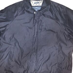 Perry Ellis Microfiber Lightweight Bomber Jacket. Black microfiber lightweight bomber jacket. Long sleeve with button cuff. Side pockets. Collared. Full zip with snap button on top and bottom. Elastic waistband on sides. Fully lined. Shell: 85% polyester/15% nylon. Lining and filler: 100% polyester. Size: large. Preowned in good condition.