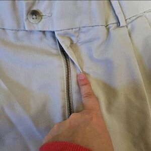This is a pair of tailored fit khaki slacks by Perry Ellis. They have the brand logo embroidered on the back near the waist. These pants have a clasp and button fly.