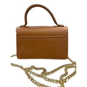 This Chic and Stylish Mini Top Handle Bag from Persaman New York , Proudly Made in Italy. This Piece is Expertly Crafted from Genuine Brown Pebbled Leather, offering a Timeless Look and Durable Quality. It is Accented with a Row of Polished Gold Tone Studs along the Front Flap.