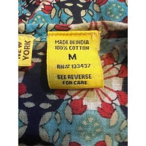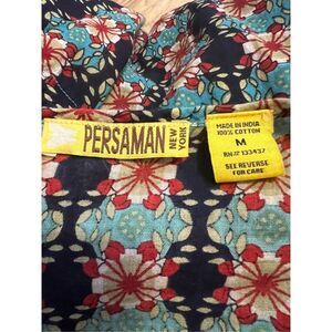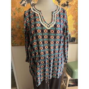 This is an absolutely gorgeous BoHo tunic from Persaman New York! Done in a abstract, blue and red pattern with ivory beading around the v-neck, this could be dressy or not. If you’ve ever looked at their website, you might find that the clothes sell for an outrageous amount of money! They are mostly known for their handbags, but they do make other products as well. This is a very eye-catching pattern and will look great with jeans or whatever you decide to pair it with. It’s in perfect preowned condition with no flaws noted made from 100% cotton to hand wash