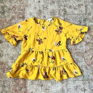 Chic mustard blouse with floral accents. Ideal for casual fall outings.