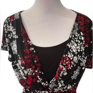 Perseption Concept Floral V-Neck Women's Top - Black red & white size Large