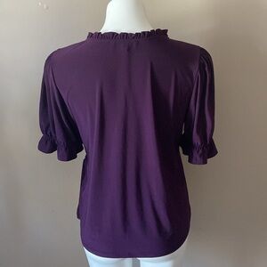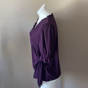 Perseption Concept Purple Plum Ruffle Neck Scoop Neck Short Sleeve Tie Blouse