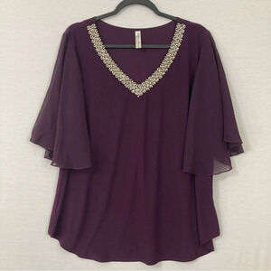 Perseption Women Purple V Neck Embellished Flutter Sleeve Blouse size 1X