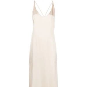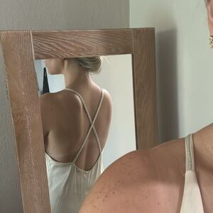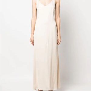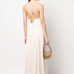 Beautiful champagne colored gown. Satin-feel, 100% viscose, embellishment strap detail, lined, low slit, hidden side zip side closure, freshly dry cleaned.