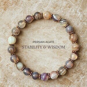 Handmade stretch bracelet with 8mm Persian Agate beads. Offers grounding, emotional balance, and inner wisdom through life’s transitions.