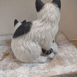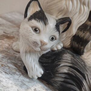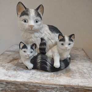 Persian Cat Momma and Kittens Ceramic Figurine. White Grey Black Vintage. C1