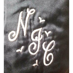 Circa 1950s black Persian lamb short coat/jacket, suitable for cocktail parties and other formal occasions. Closures are 2 thread covered hooks and eye, one at the neck and one about half the way down the length. Collar may be mink. Very heavy and very warm. Sleeves can be folded up to 4" shorter as needed. Nicely lined jacket with owner's monogram on inside right side. Two slit pockets.