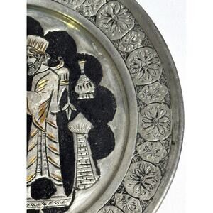 This is a beautiful and unique piece of Persian Qajar art! It features a pewter/tin decorative plate/wall art with intricate hand-etched designs and copper inlays. There are two figures represented on the plate possibly Persian Kings or religious figures on a dark background creating a striking contrast to the tin/copper inlay figures. The art plate measures 8.25" in diameter and is in very good vintage condition consistent with age. See photos to verify/determine details and condition. The craftsmanship is exquisite, and the piece exudes an antique charm with the aged patina. Perfect for adding a touch of cultural elegance to any room. # 4731