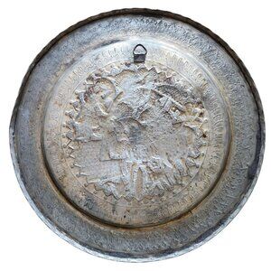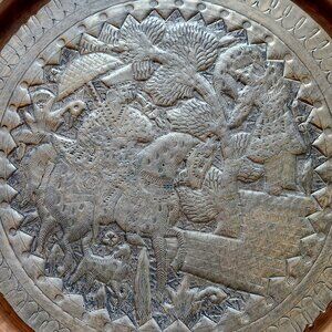 Persian Vintage Tooled Middle Eastern Hunting Scene Tin Metal Wall Plate