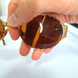 This pair of vintage Persol Ratti 2002-S sunglasses, expertly crafted in Italy during the 90s, features oval lenses and a gold frame adorned with thin circles in a turtle effect. The timeless design is complemented by dark turtle acetate temples that extend to the terminals for a polished look.
