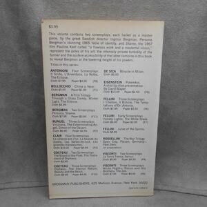 Persona and Shame: The Screenplays of Ingmar Bergman by Ingmar Bergman 1972 Grossman Publishers Paperback. Ingmar Bergman is still the doyen of cinema. He is known for masterpieces of controlled human emotion, exploring every facet of the personality in relentless detail. He wrote: "I had the possibility of corresponding with the world around me in a language that is literally spoken from soul to soul." These two screenplays, liberally illustrated with production stills featuring actors, including his favorite actress, ex wife, Liv Ullman, are classics of the screen. Paperback book. Some yellowing of the pages. Please see pictures.
