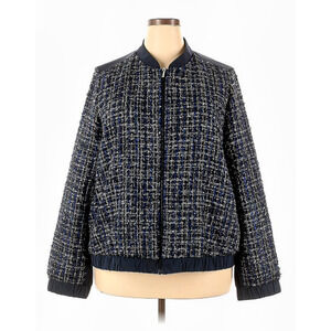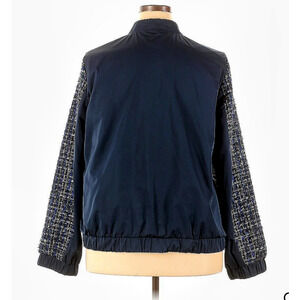 Persona by Marina Rinaldi Navy Woven Metallic Tweed Zip Front Bomber Jacket Sz 18 (Plus). Retails for $318. Measures 28.5" long. Photo measurement is of armpit to armpit. Pre-owned, this jacket is in very good condition. Slit pockets. Elastic hem and cuffs. Really nice jacket.