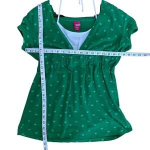 Personal Identity Top Womens Size XL Short Sleeve Hoodie Built-in Halter Green. This casual fun top is from the Y2K era. It is green with a white heart pattern. There is a babydoll elastic hem under the chest area. It is hooded and has a built in white halter that ties around the neck. It is labeled as a size XL and measurement photos are included. The babydoll elastic hem is stretchy. Good used condition. Y2K, rave, casual, whimsygoth, streetwear, pop, twee, adorable, sporty