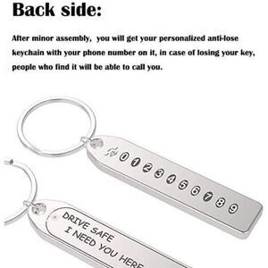 It is not only a keychain with engraved ‘Drive safe I need you here with me’, but also an anti-lose keychain, after 3 minutes DIY assembly, you will get a personalized keychain with your phone number on it, in case of losing your keys, people who find it will be able to call you.