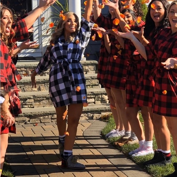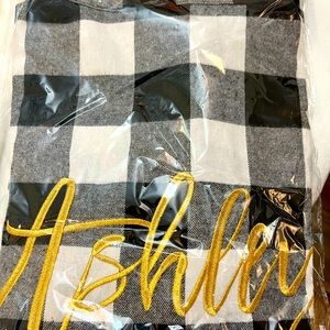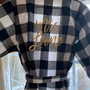 This robe was ordered for a gift. Never worn still in package. 100% cotton. It is knee length or below (depending on height). This would fit a size 10-16. The name is “Ashley”.