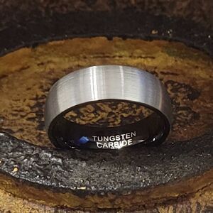 This is real Tungsten, the inside of the band has a durable black powder coat and the outer band is brushed steel.
